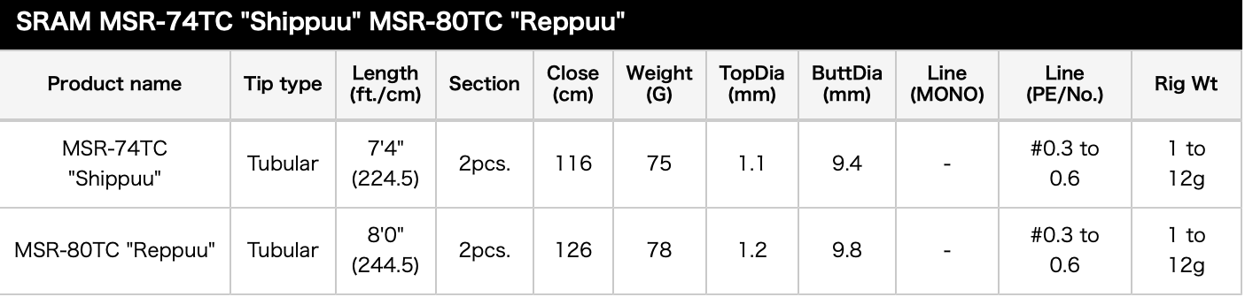 Art. # 4988540223485Ultra-light and highly sensitive, the TICT SRAM MSR-80TC Reppuu delivers long-distance casting power and precision control for technical light game fishing.