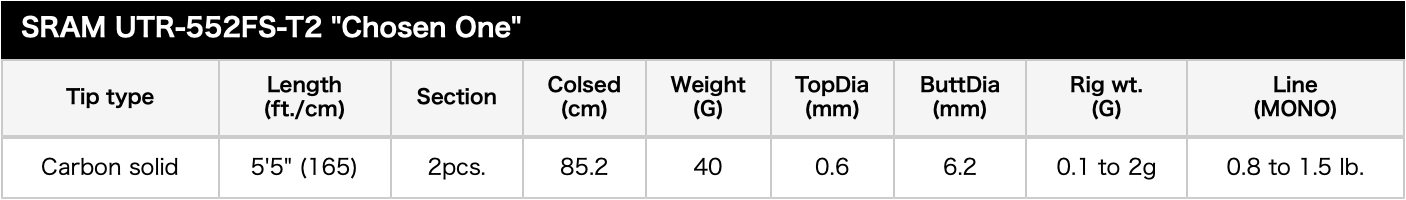 Art. # 4988540178136Ultra-light and ultra-sensitive, the TICT SRAM UTR-552FS-T2 Chosen One delivers elite finesse control and precision for technical light game fishing.