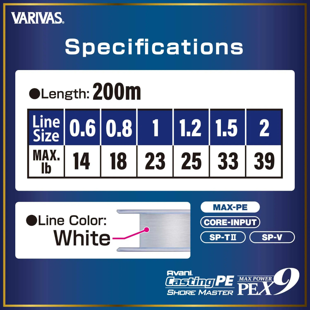 Art. # 4513498130846Varivas Avani Casting PE Max Power X9 Shore Master delivers extreme casting distance, low stretch, and unmatched sensitivity for shore anglers.
