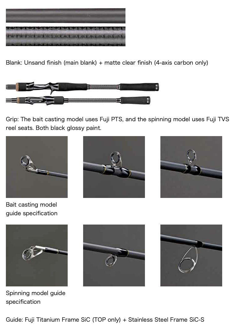 Основният материал е високо до средно еластичен карбон, а секцията за прилеп е подсилена с 4-осен карбон. Водачът TOP е проектиран да подобри допълнително чувствителността чрез използване на лека титаниева рамка.